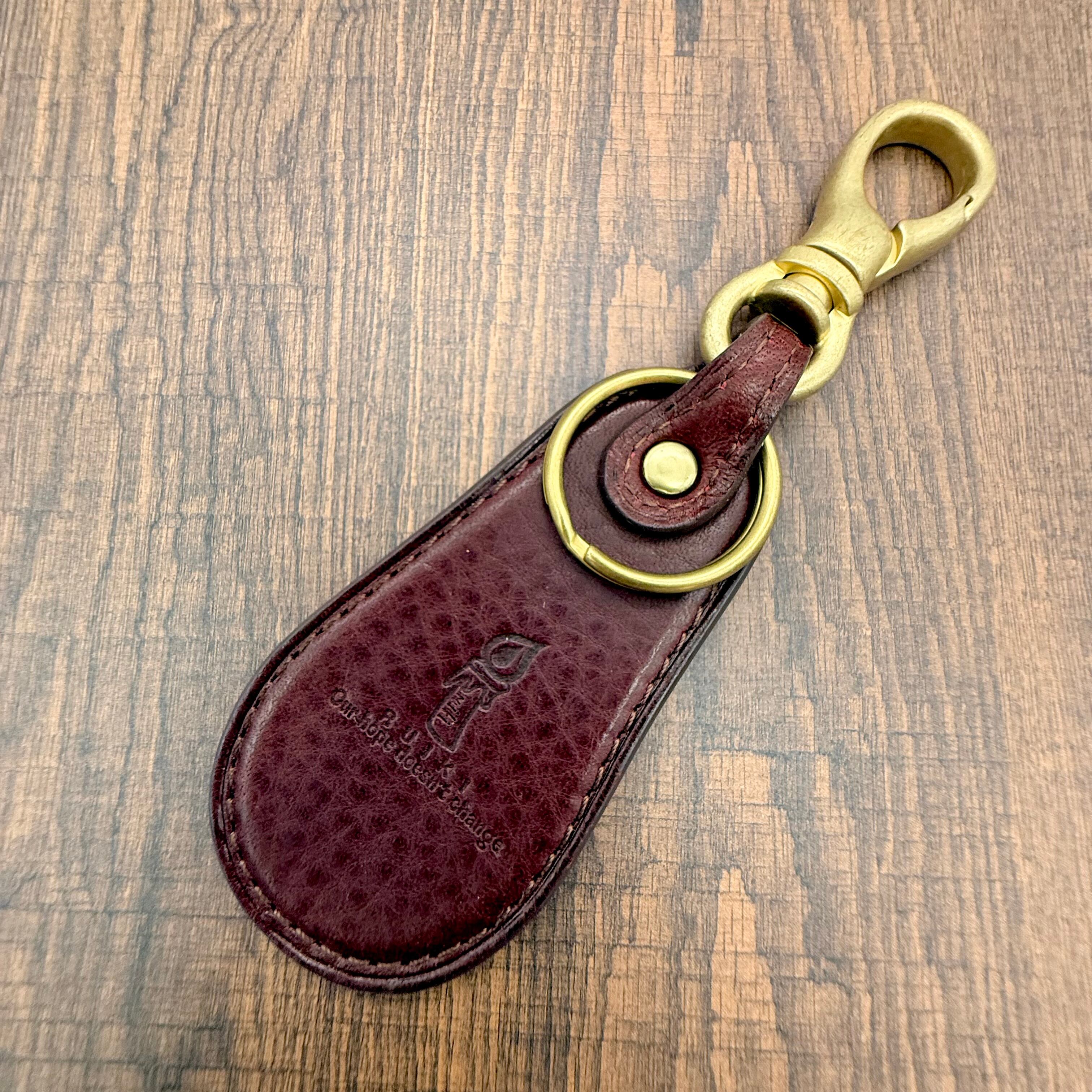 この靴ベラは、イタリアンオイルレザー(バケッタレザー)を使用しており、その高級感あふれるデザインと質感が魅力です。キーホルダーでありながらもラウンド形状は靴ベラとして靴の着脱をサポートします。